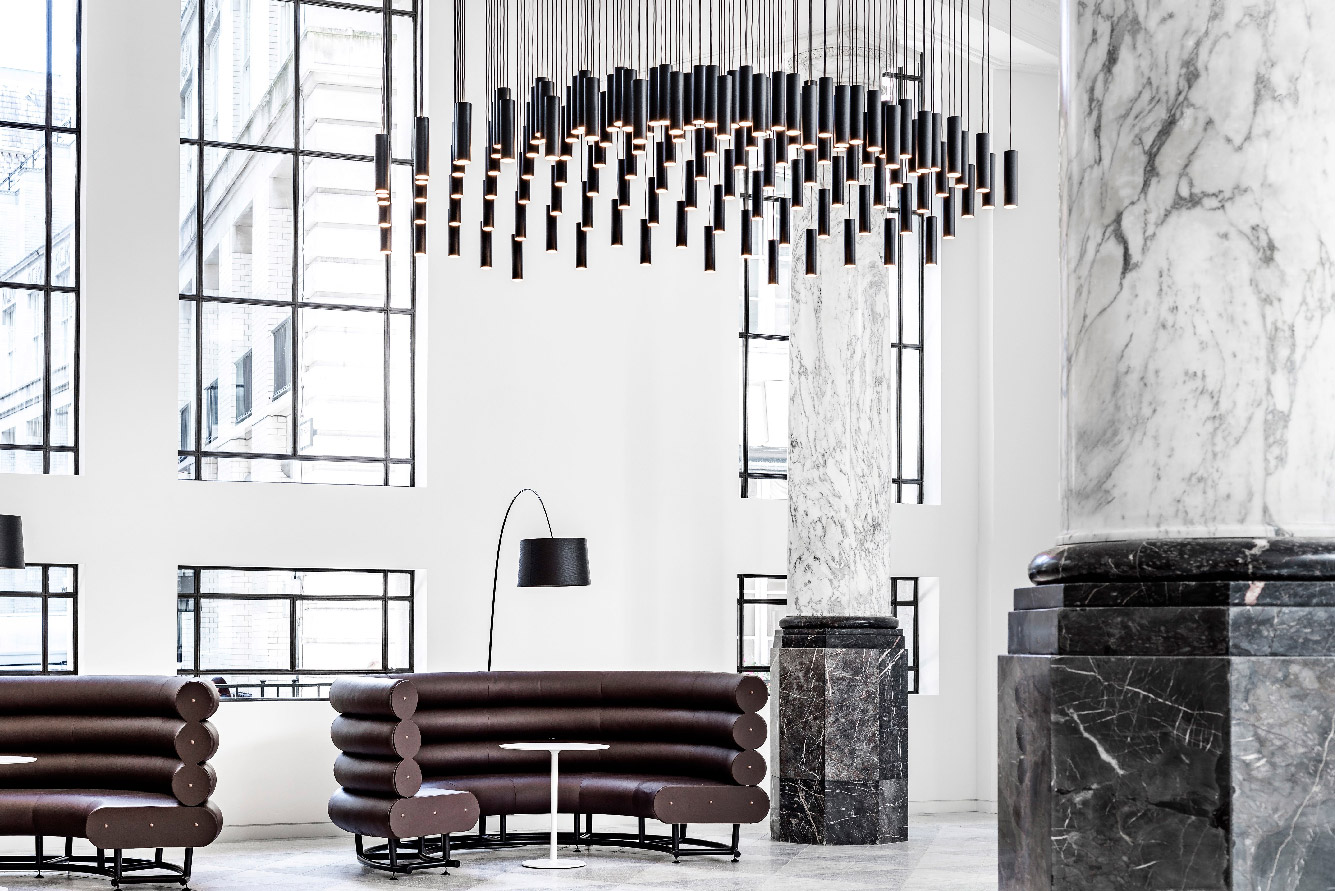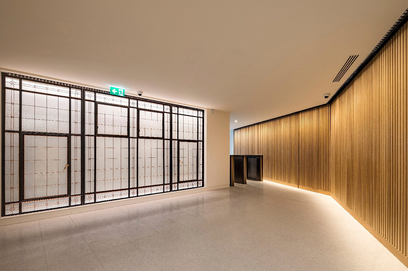 This was the wholesale redevelopment of an old banking hall in the City of London for Kajima Properties, for which Pritchard Themis developed the solution for the reception hall, including the design for a grand feature pendant at the heart of the space. An ‘invisible’ finish, plaster-in ceiling rose connection was conceived and developed for the 152no pendant points, along with the support frame behind the plaster that could only have four fixing points back to structure. Various other lighting solutions defined the timber walls and provided additional focus.