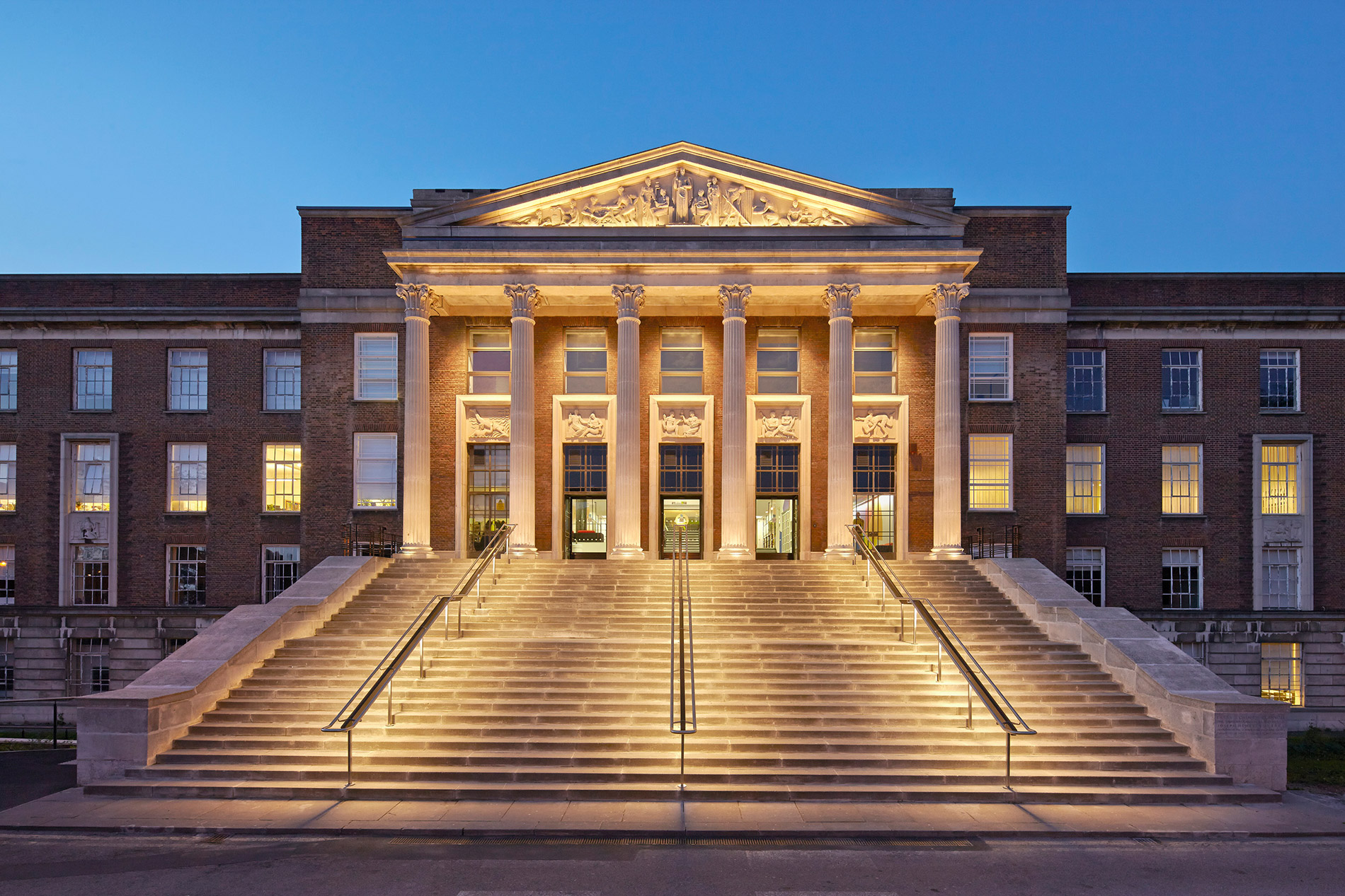 An exterior lighting design for this further education facility in North London. We designed a solution to illuminate the various aspects of the façade as well as providing functional lighting to the stairs and portico areas. Warm white lighting enhanced the limestone cladding and helped maintain a richness to the colour scheme and provide a welcoming glow for pedestrian visitors to the site.